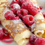 Delicate, thin crepes filled with smooth vanilla cream and juicy raspberries—a dream dessert! 🍇🥞✨ These Raspberry Vanilla Cream Crepes are light, elegant, and incredibly easy to make, even for beginners. A perfect treat for brunch or a sweet indulgence—who’s craving a bite? 😍